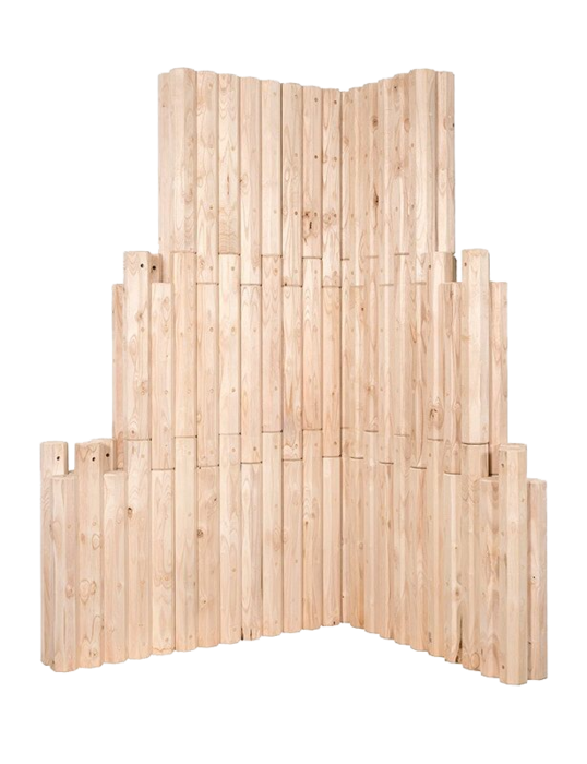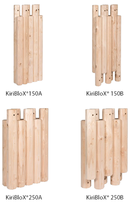KiriBloX® ist ein standardisiertes Wandmodulsystem aus 100 % Holz, das aus vertikalen, Achtkantprofilen aus Kiriholz besteht. Die Module werden ohne Leim oder Metall durch präzise gefräste Systemdübel aus Kiefernholz verbunden, wodurch eine stabile und nachhaltige Konstruktion entsteht.